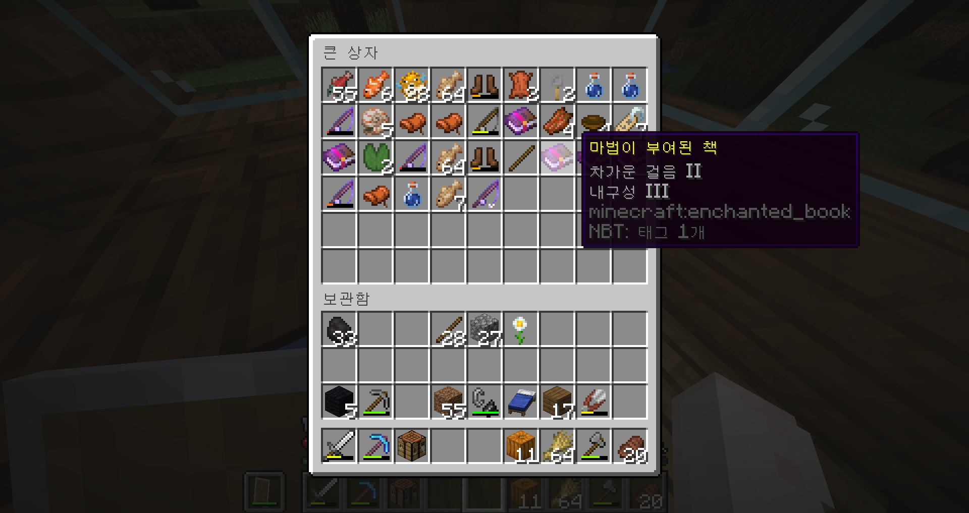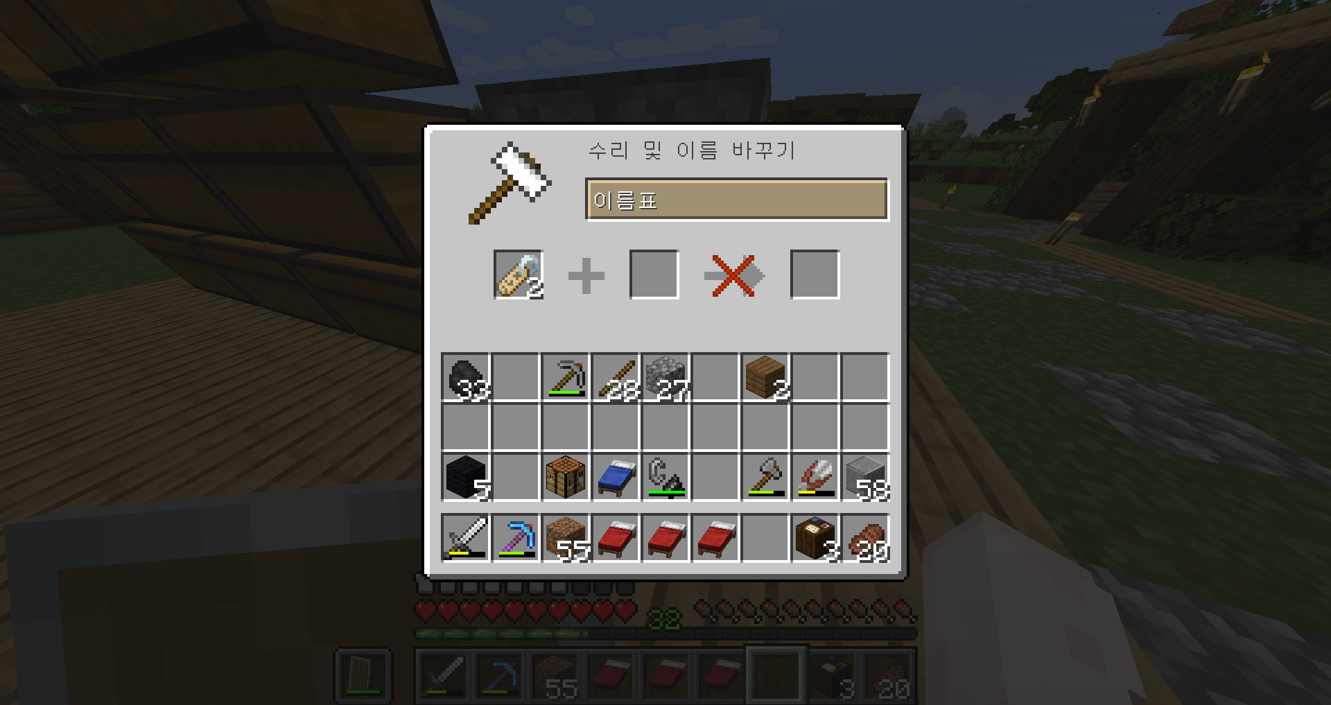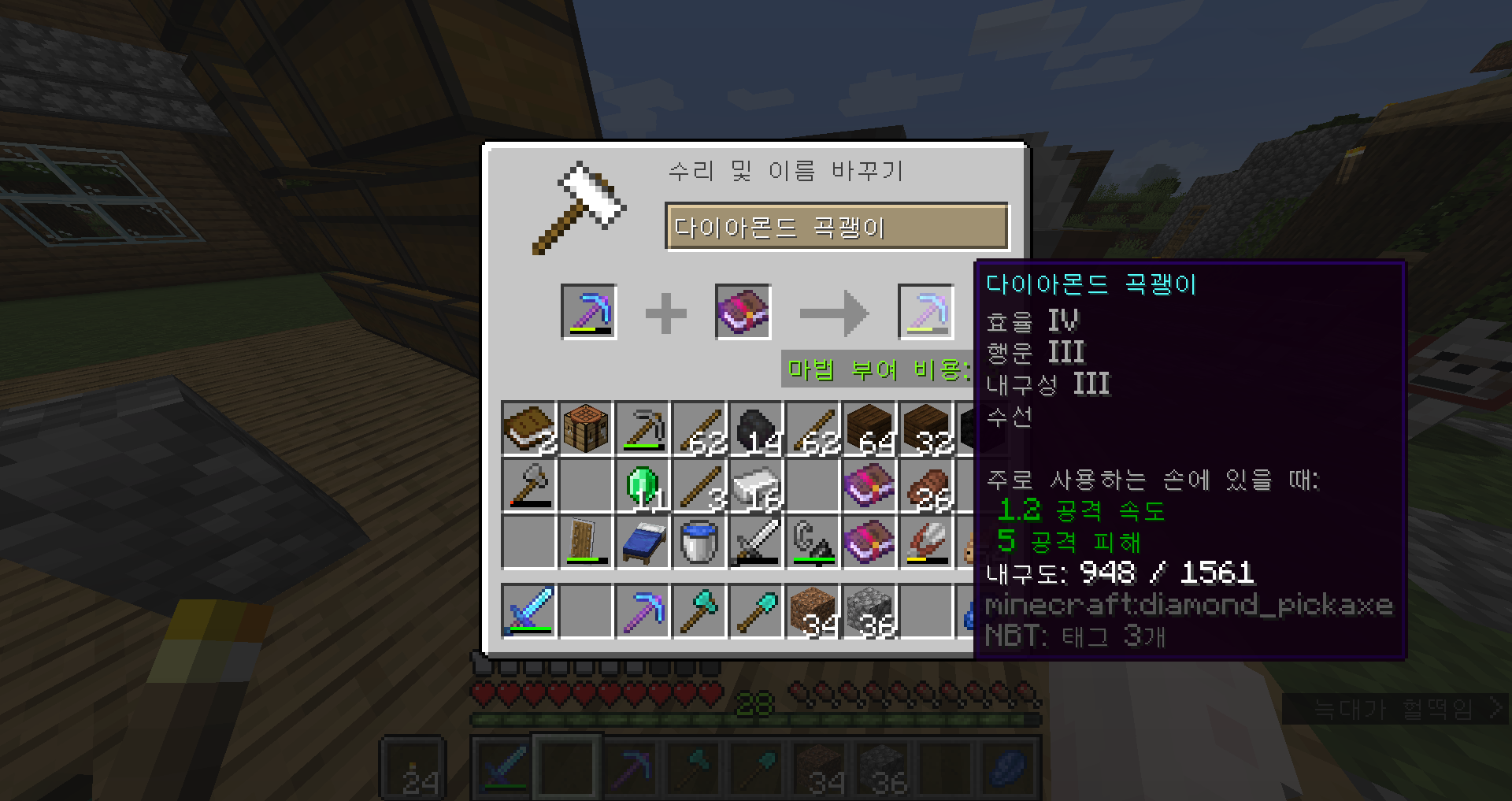 우선 주민 한마리를 꺼내서 수선 인챈트 사서 작업을 먼저 하기로 했어요