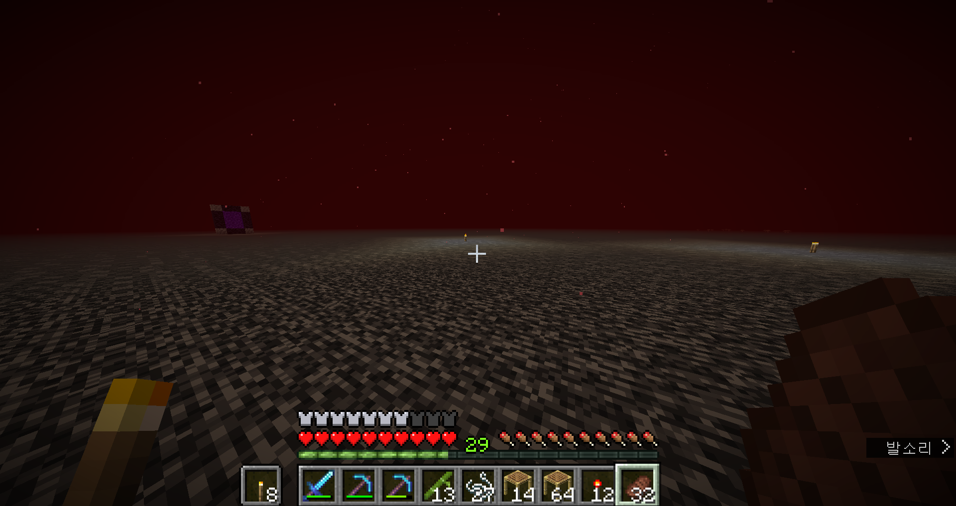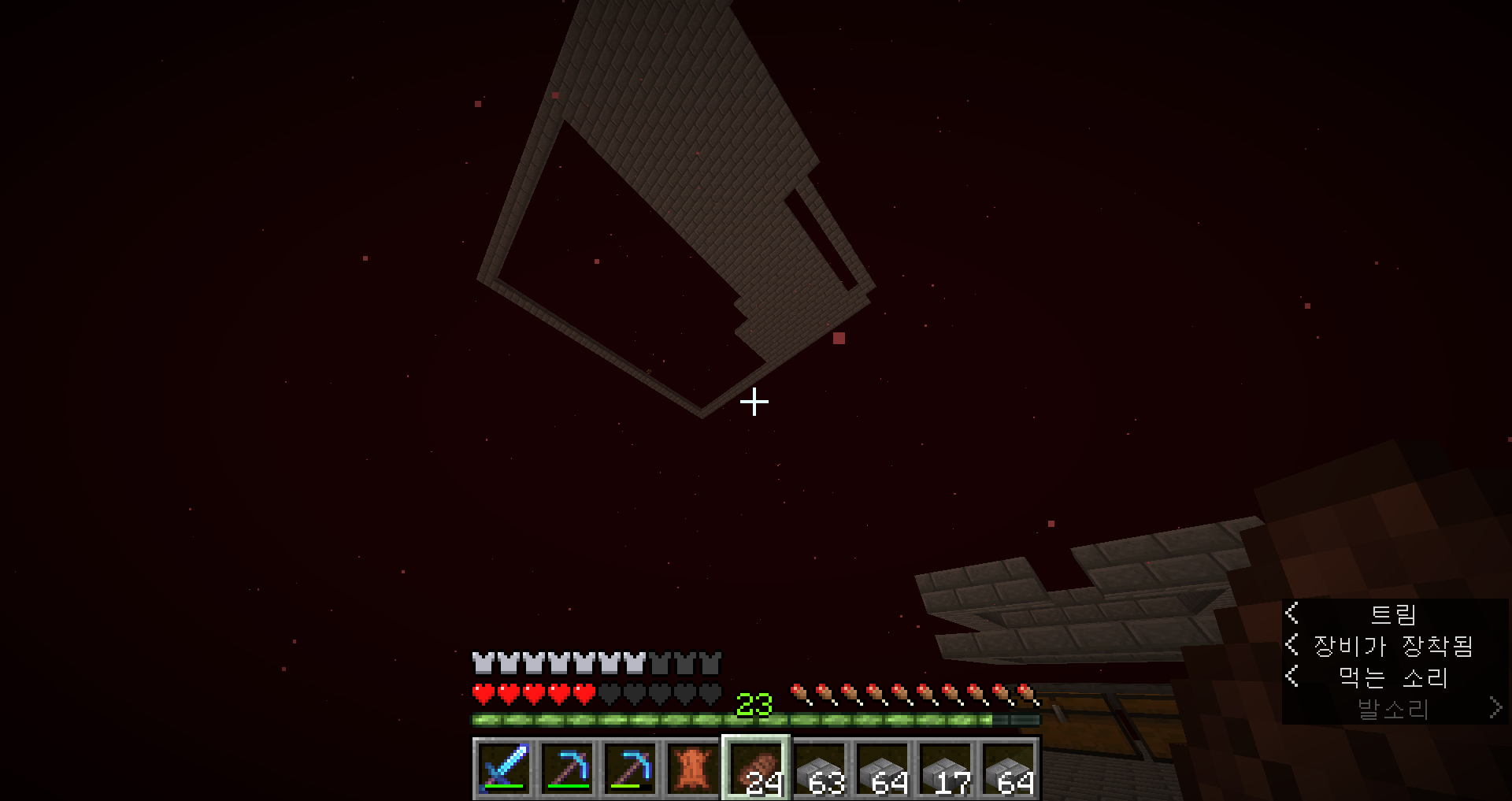 6화까지 정주행하신 분들은 알계지만 제 스퇄은 오버월드 지겨워 지면 네더가고, 네더 지겨워지면 오버월드 오가며 장치 하나 혹은 건축하나씩 하는 스퇄입니다. 지난 회차에 좀비피글린 농장 만든다고 네더에서..