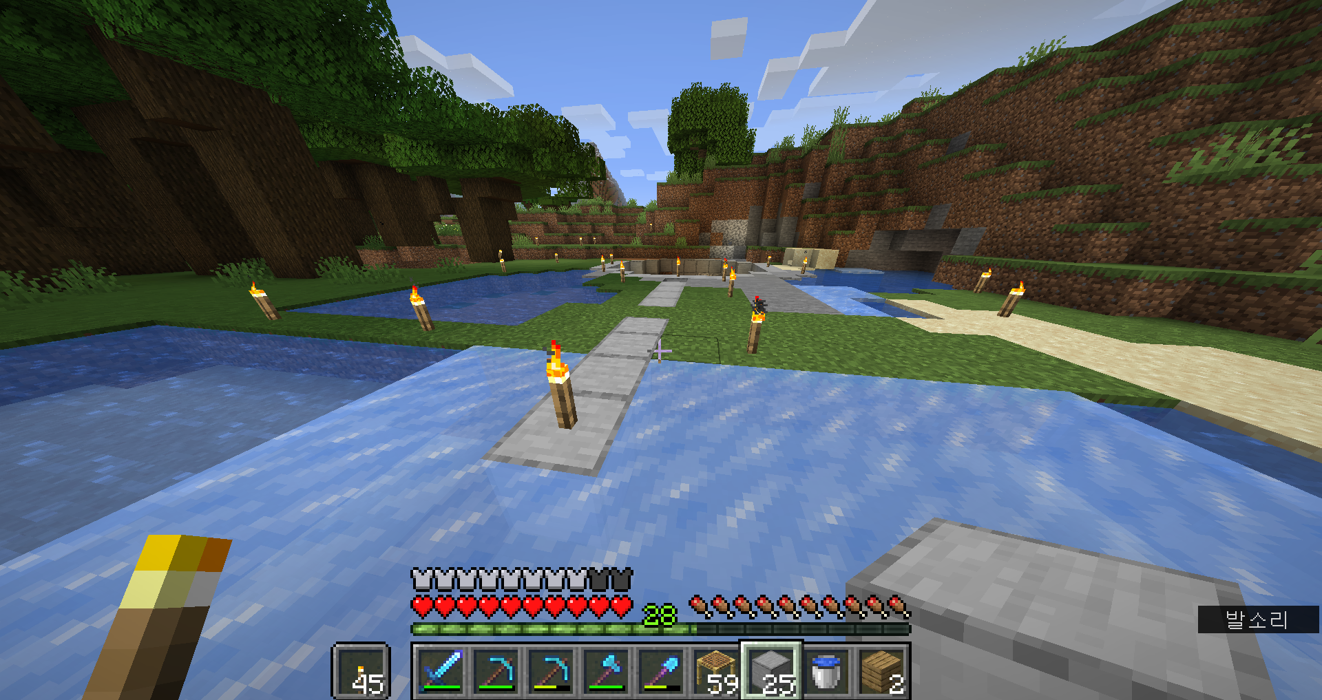 몹타워 이쪽으로 오르락 내리락 할 수 있게 남겨두웠던 물줄기를 끊어줬어요