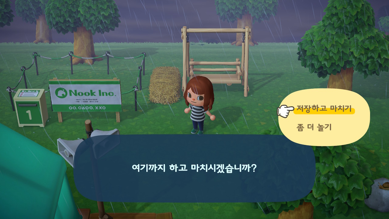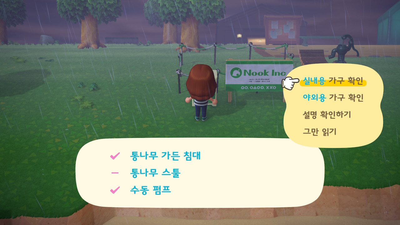 재접속하자마자 달려서 마지막 야외용 가구를 설치하고 실내용(실외용) 가구 확인을 한번 선택하셔서 목록을 확인하고 "이 주택에 필요한 가구는 실내용도 야외용도 다 모였다"는 알림이 뜨면 빠르게 너굴이한테 달려주세요.