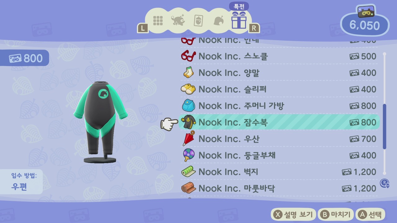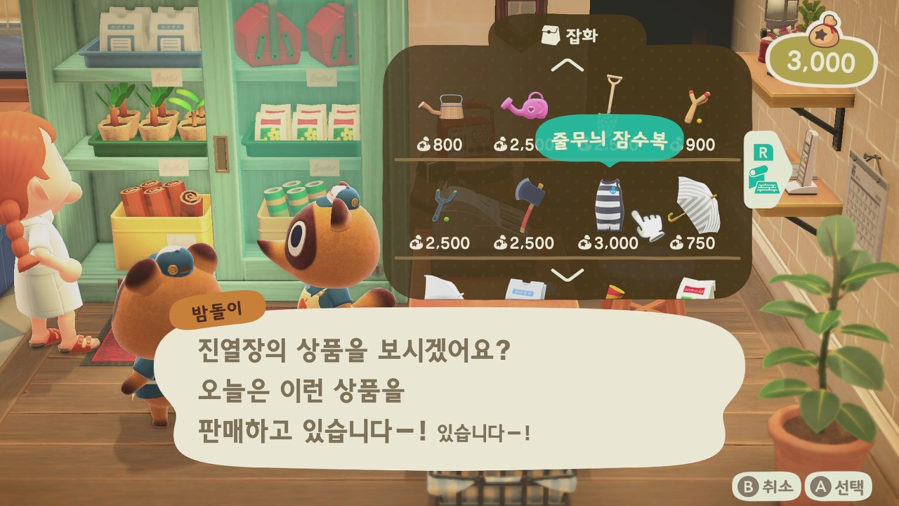 그리고 상점에 잠수복 아이템이 추가되었습니다. 튀동숲과 마찬가지로 잠수복을 입어야만 바다로 들어갈 수 있게 될 것 같습니다.