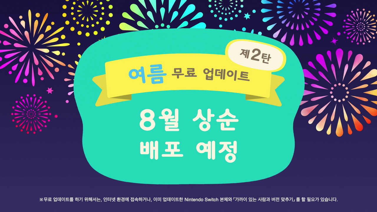 여름 무료업데이트 2탄은 8월 상순 배포 예정입니다. 이 업데이트의 내용은 아직 공개되지 않았으나 '계절 이벤트'가 추가된다고 언급이 있었어요. 튀동숲에서도 있었던 '불꽃축제'로 많은 분들이 추축하고 있습니다.