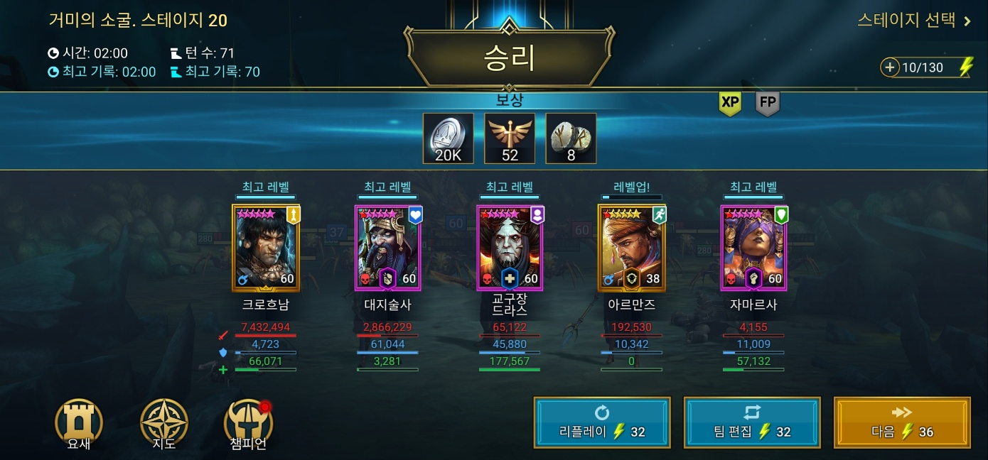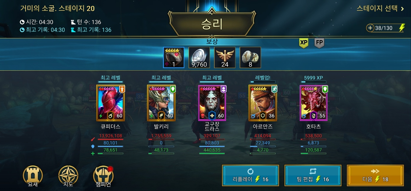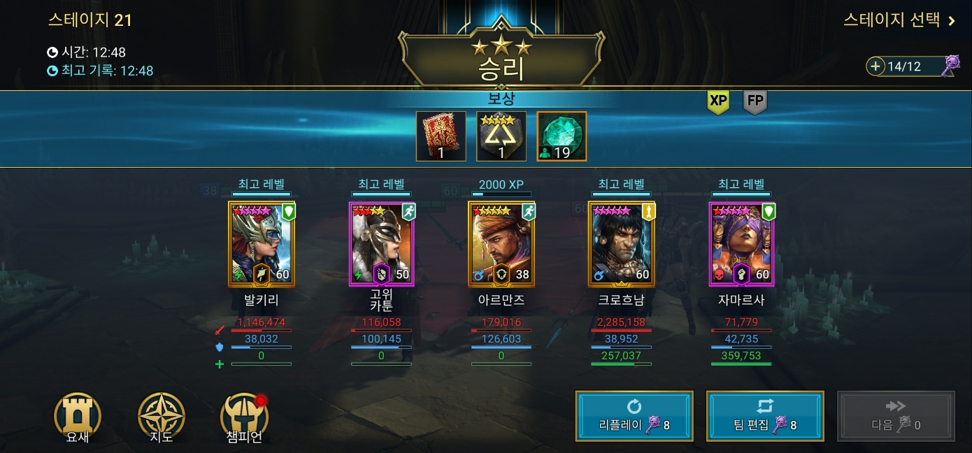 크로흐남+자마르사 엄청 좋네... 2분대로 안정적으로 클리어. 아르만즈는 그냥 턴미터 감소용이라서 스작이고 마작이고 렙업이고 진화고 아무것도 안되어있지만 밥값을 충분히 한다. 아르만즈는 진짜 S급 챔피언 맞는듯.