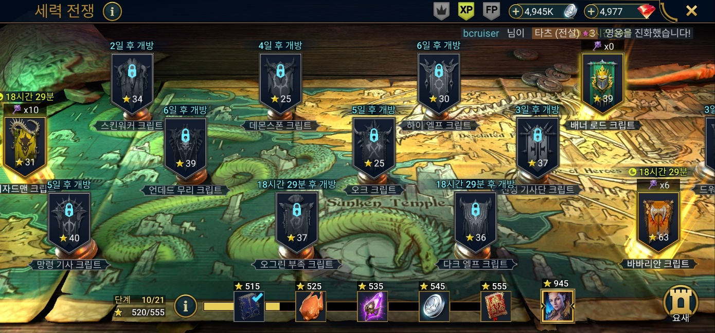 세력전은 보다시피 바바리안 크립트 말고는 진행 상태가 그닥이라 리디아까지는 아직 한참 남았다. 보통 하이엘프 크립트를 심판자가 멱살잡고 캐리해줘서 처음에 많이들 클리어한다하는데 하이엘프 세력 챔프는 에픽조차 쓸만한게 없어서 다음 4월 합성 때 조각상태인 야니카를 소환해서 도전해보려고 한다.