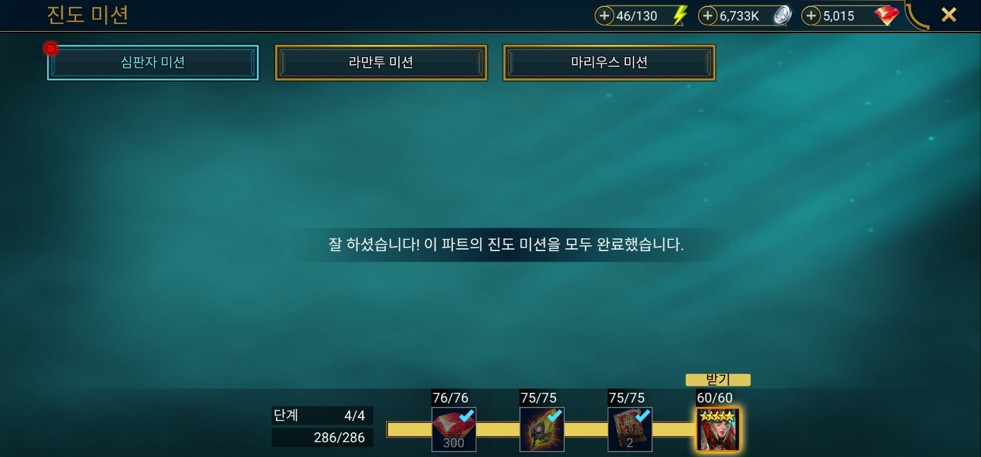 쉬는 기간에 심판자 미션 완료. 역시 챔피언 풀이 부족한 건 아니었고 클랜전 기간에 챔피언들 스킬 작 해주고 타이탄 이벤트 쉬면서 남는 번개로 미궁을 돌아 마스터리작을 해주니 클리어가 됐다. 심판자는 다음번 합성 실반감시자 챔피언 합성 때 챔체이스 점수를 위해 그 때 소환하려고 일부러 보상을 받지 않았다.