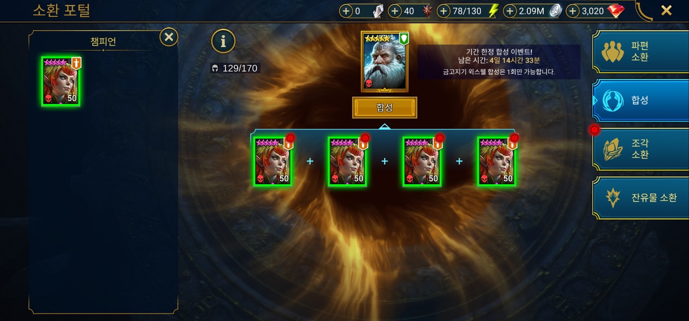 챔피언체이스는 드렉스타르를 뽑고 최대한 합성으로 점수를 얻고 소환러쉬를 위해 파편을 많이 아꼈다. 클보 2배보상을 받지 못하고 초악 최고난이도 상자를 받질 못해 항상 소환러쉬가 제일 어렵기 때문. 소환러쉬가 먼저 있는 일정같으면 챔체이스가 여유가 있는데 소환러쉬가 뒤면 파편 수급량 계산이 어려워 챔체이스 점수를 다 합성으로 채워야해서 챔체이스도 어렵다.