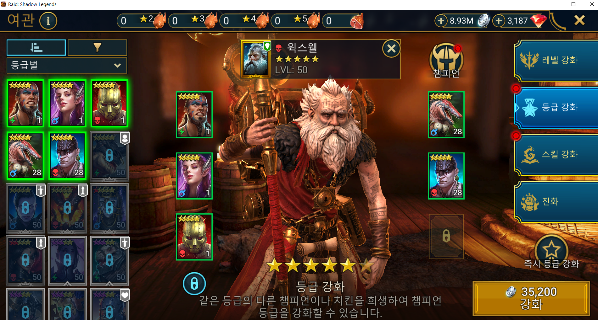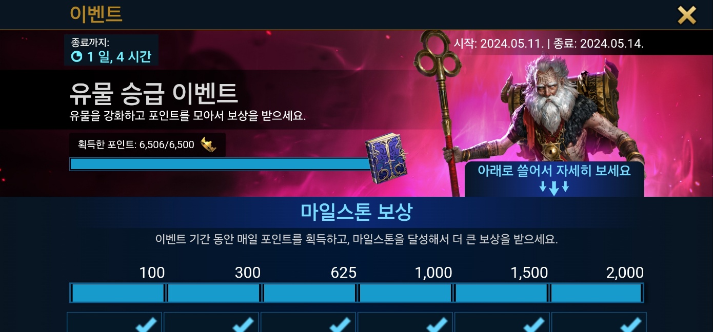 근데 있는 자원 다 털어가면서 무리해서 맞추려고 노력했는데 스킬북 부족과 유물 부족으로 아직도 셋팅을 못 끝냈다. 윅스웰 너프 되기 전에 1키만들고 자동전투 돌리는게 목표였는데 가능할련지...