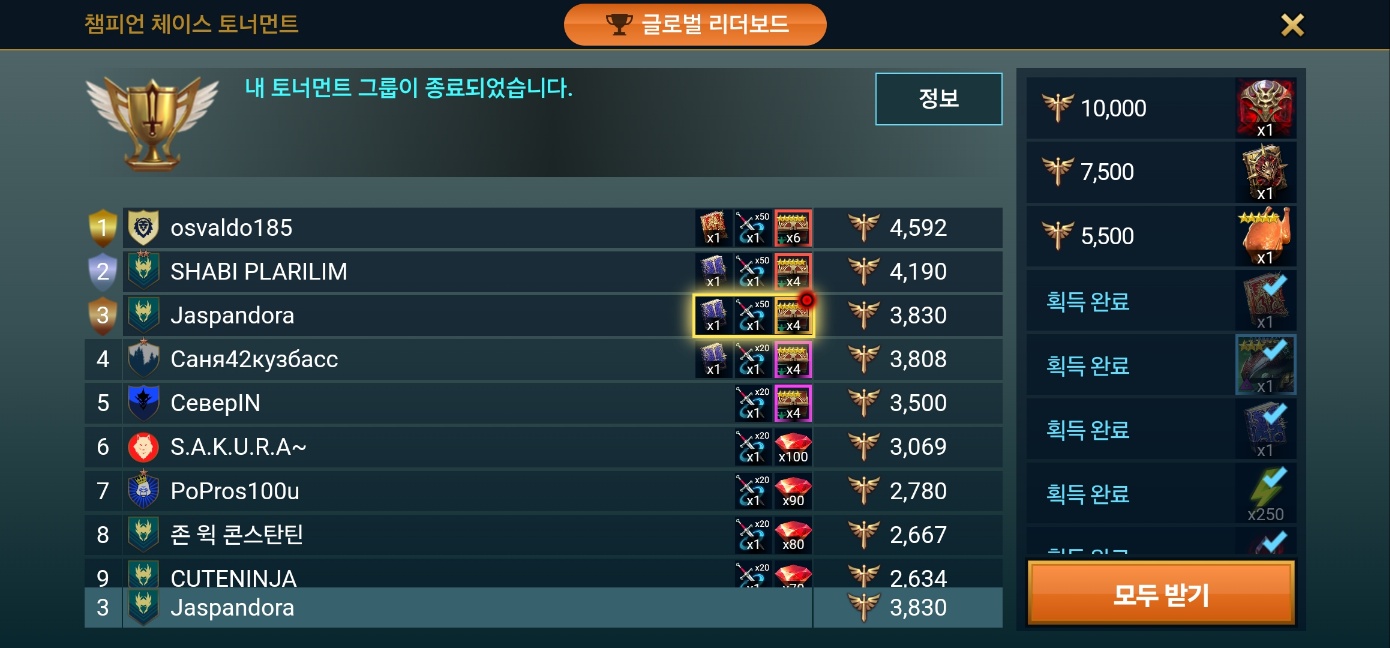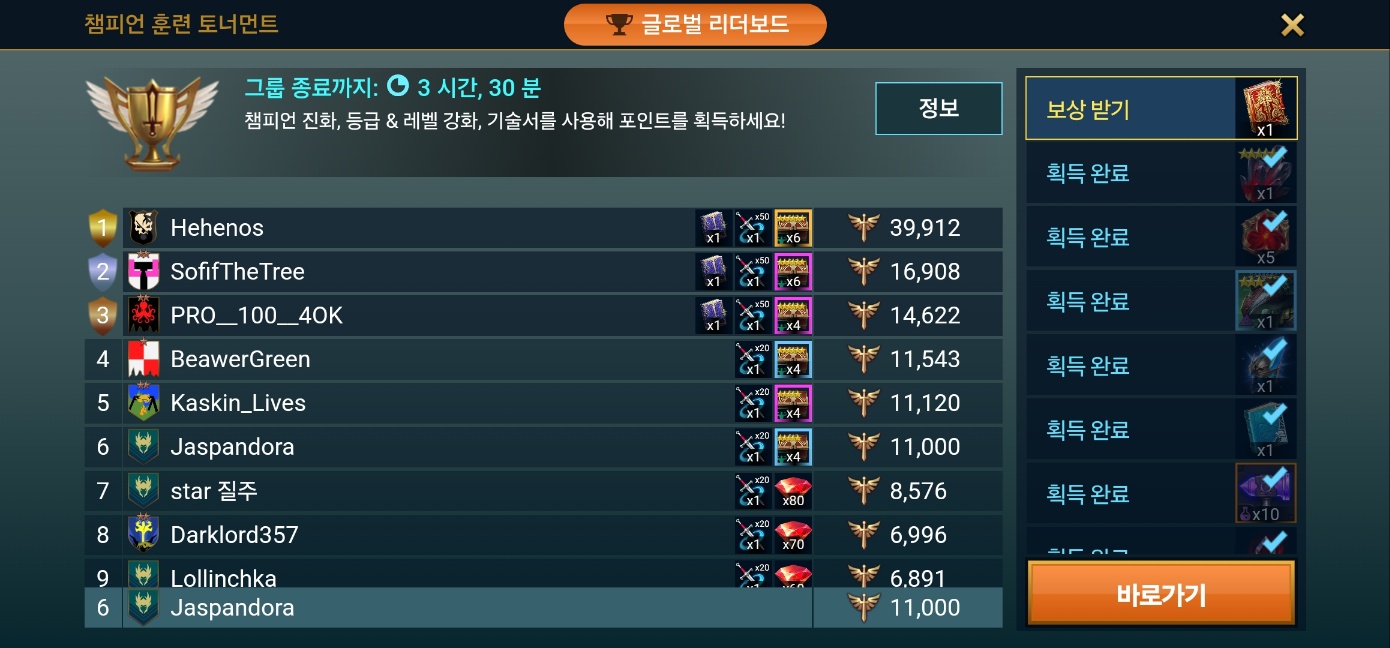 순위 노리려고 한건 아닌데 토너먼트 그룹 잘 만나서 끈기셋도 받아진 챔훈.